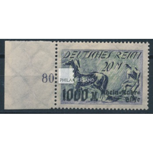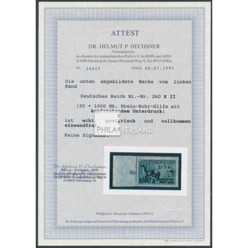Rhein + Ruhr Hilfe 1923 - 1000 Mark mit seltenem, kopfstehendem Unterdruck, einwandfrei postfrisch vom linken Bogenrand und völlig ohne Signaturen (auch der Bogenrand postfrisch und ungefaltet) und mit Attest Dr. Oechsner, BPP