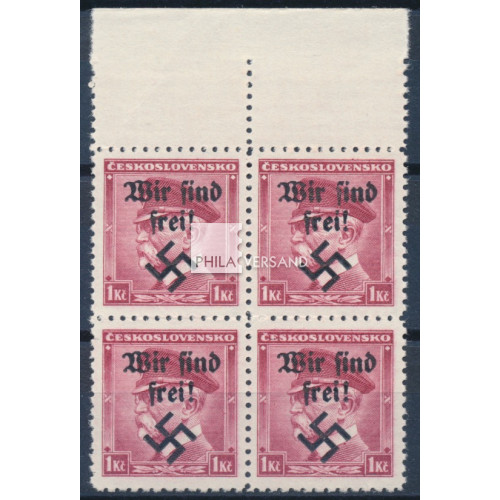 Aufdruck 1938 - 1 Krone im postfrischen Viererblock vom oberen Bogenrand